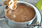 Завариваем кофе в молоке, как обычно варим на воде, и немного охлаждаем. Масло, сахар и какао растапливать на медленном огне. В муку добавить немного молока и размешать, чтобы не было комочков. Заваренный кофе вылить в шоколадную смесь и продолжать нагревать. В подогретую смесь влить и быстро вбить яйцо. И влить муку в молоке и быстро мешать венчиком. Держать на огне до загустения, потом выключить и сразу же охлаждать в миске с холодной водой.