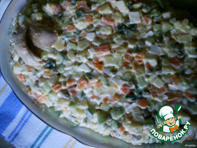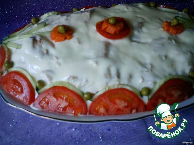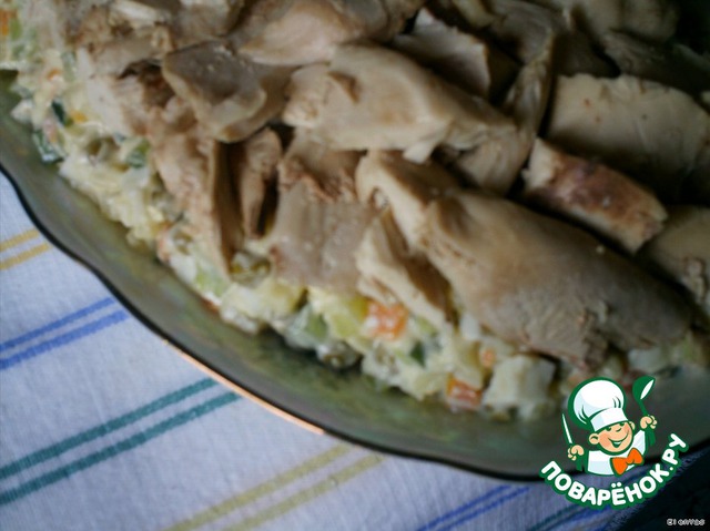 Первый раз пробовала такой салат в гостях, очень понравилось. Хозяйка застолья любезно поделилась рецептом - у них это фирменный домашний салат. А они, в свою очередь этот рецепт увидели в старой "Книге о вкусной и здоровой пище". Получается этого салата много, как раз для большой компании. Кто не любит много майонеза - можно пополам со сметаной - тоже вкусно. А можно заливку не делить на две части и сделать весь майонез с желатином и слои выкладывать немного в другой последовательности: салат - курица - салат.