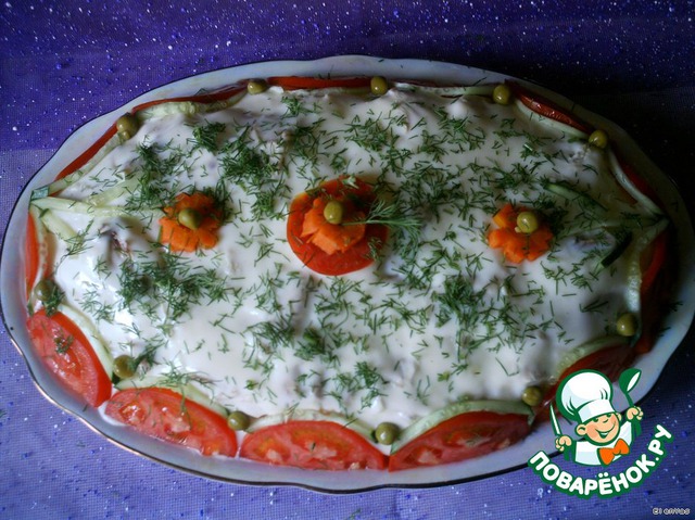 сверху украсить кубиками помидоров и небольшими кучками мелко нарезанного зеленого салата (у меня была 1 помидорка и пучок укропа, морковку взяла из отвара)
