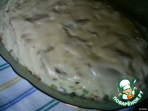 Оставшийся майонез смешать с растворенным желатином, поставить в холодную воду и взбивать веничком до образования пены