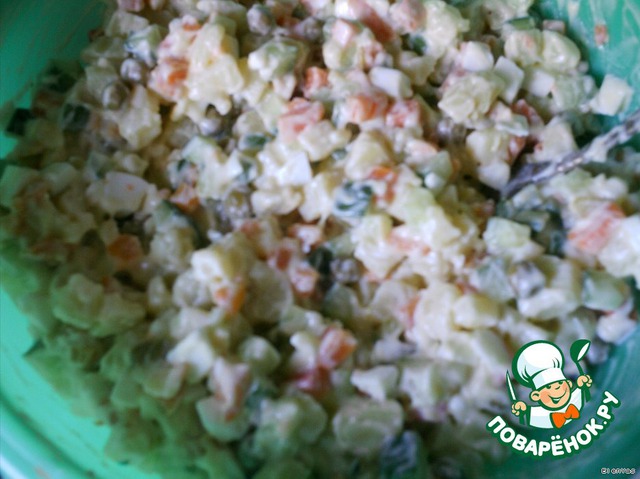 Огурцы, вареные овощи и яйца нарезать кубиками, добавить горошек, перемешать с половиной майонеза -