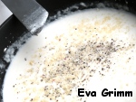 Соус будет на основе Бешамель. Сливочное масло растопим на сковороде, дабавим муку, хорошо вымешаем, добавим молоко, постоянно помешивая, доведем до густоты (соус должен быть как кефир), присолим, поперчим, добавим пармезан.