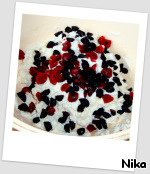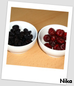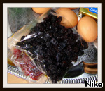 Вышня слишком крупная и я её разрезала ножницами на 4 части. Изюм чуть меньше вишни, его разрезала пополам. (В оригинальном рецепте был только изюм ).