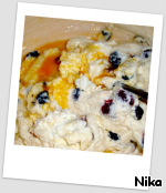 Рикотту перемешала с сахаром, ванилином, вишней, изюмом, цедрой