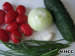 Берём помидоры черри, огурец, репчатый лук (можно готовые кольца, полукольца), чеснок, зелёный лук. |