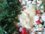 Смешиваем салат с соусом, добавляем нарезанный укроп, перемешиваем. |