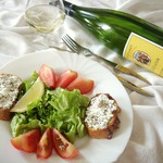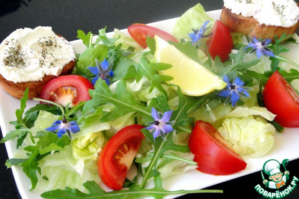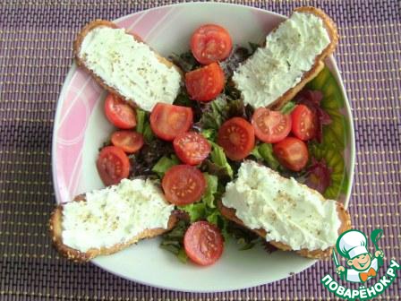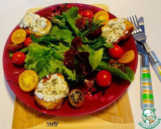 Готовые кростини с подогретым козьим сыром выложить по бокам салата и сразу же подавать к столу. |