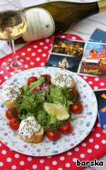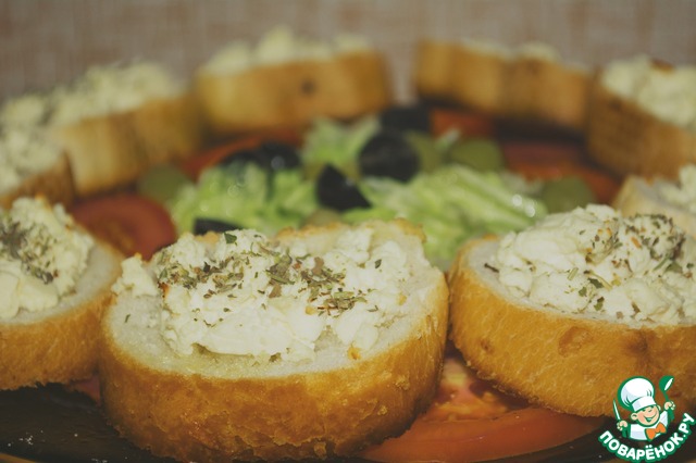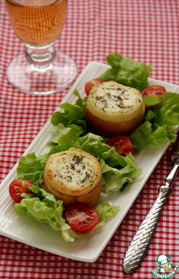 На каждый кусочек багета выложить по 1-1,5 ч. л. козьего сыра и посыпать прованскими травами. Продолжать запекать в духовке ещё 3-5 мин. |