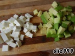 Авокадо очищаем от кожицы, удаляем косточку и нарезаем кубиками. Фету также нарезаем небольшими кубиками.