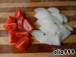 Помидорки черри нарезаем четвертинками, лук очищаем и нарезаем полукольцами.