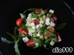 Приготовим заправку. В небольшой мисочке смешиваем оливковое масло, соевый соус, уксус, соль и черный молотый перец. Рукколу промываем, обсушиваем и выкладываем на тарелку, сверху выкладываем лук, затем авокадо, фету и помидорки. Перед подачей полить заправкой.