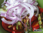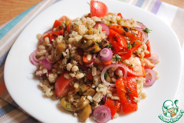К перловке добавляем овощи-гриль, маринованный лук вместе с маринадом.