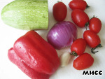 Берём овощи: красный сладкий перец, красный лук, помидоры черри, чеснок и кабачок-цуккини.