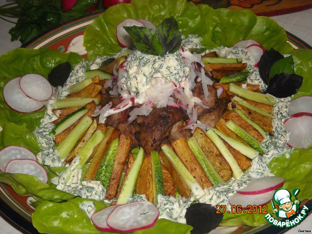 Блюдо выстилаем листьями салата, выкладываем горкой печень, вокруг печени укладываем картофель с огурчиками, сверху горкой натертый редис, поливаем заправкой и все - готово. Быстро, просто и вкусно! Приятного аппетита!
