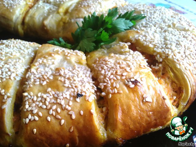 Тесто раскатать, сверху выложить начинку, свернуть в рулет. Выложить на противень, застеленный пергаментом и смазанный маслом, изогнуть. Смазать рулет желтком.