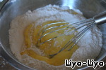 Жидкую часть теста вливаем в сухую и перемешиваем.