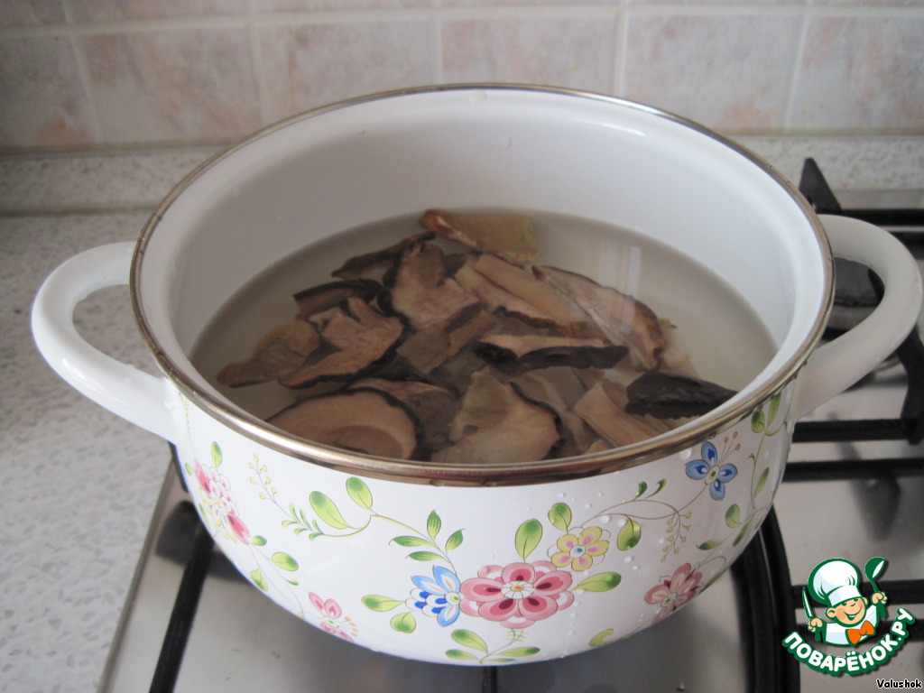 Замачиваем сухие белые грибы на 2 часа в воде.