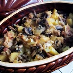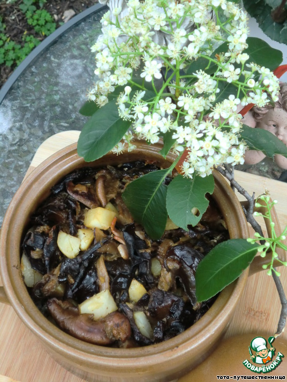 Заливаем грибным соусом, если соус густой, надо добавить немного воды в каждый горшочек.
