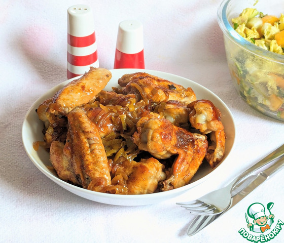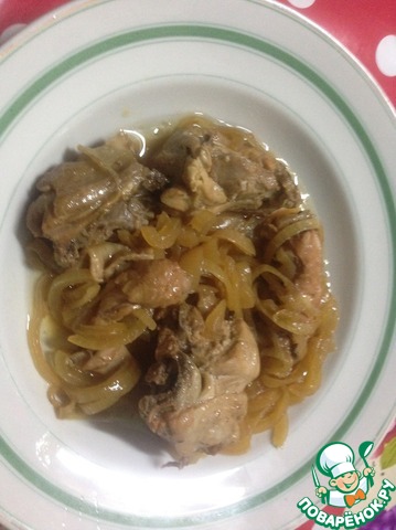 Получилась очень вкусненькая курочка. Не пугайтесь сахара в рецепте. Блюдо получится не сладким, а только лишь несколько сладковатым и то, только куриная шкурка, а мяско получится необыкновенно вкусным и нежным. А лучок - это просто объедение.