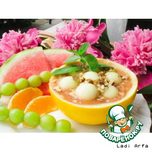 Разлила по импровизированным чашечкам из дыни, выложила дынные шарики, посыпала грецким орехом и украсила мятой :)