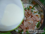 Смешать с молоком, залить мясо с овощами, варить до готовности. За 5 мин. добавить лавровый лист, перец и мускатный орех. Украсить зеленью.