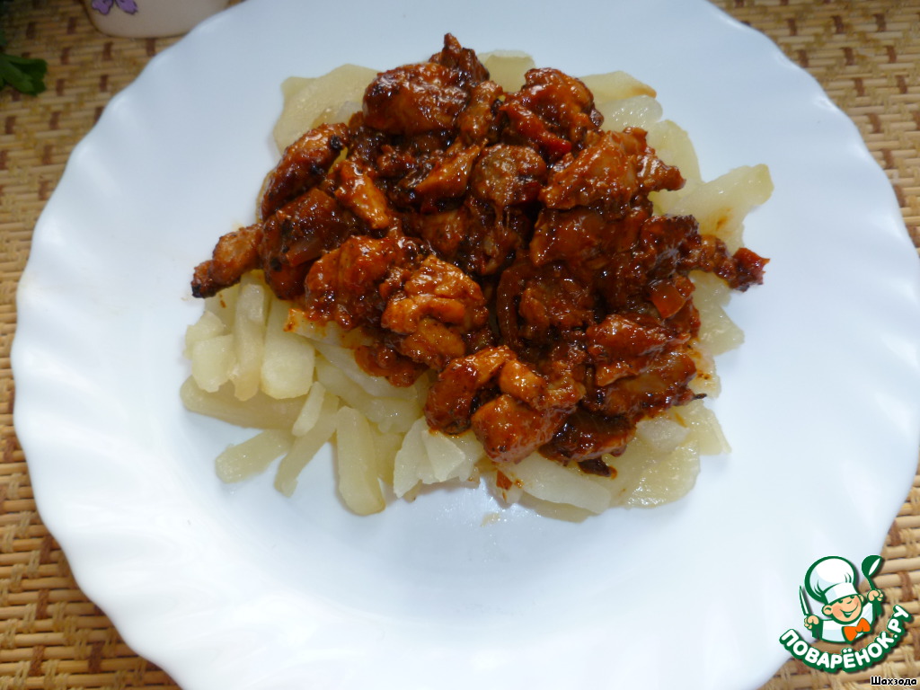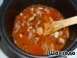 Так же добавить 1 ст. л. аджики, томатную пасту, немного воды, посолить и тушить все вместе в течение 10-15 мин
