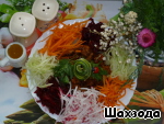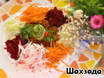 Вокруг мяса с картофелем выложить горками подготовленные овощи (нарезанные соломкой огурец, редис, свеклу, морковь)