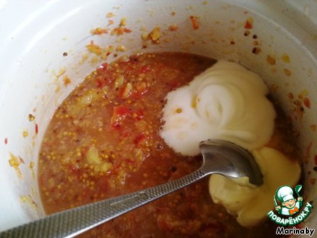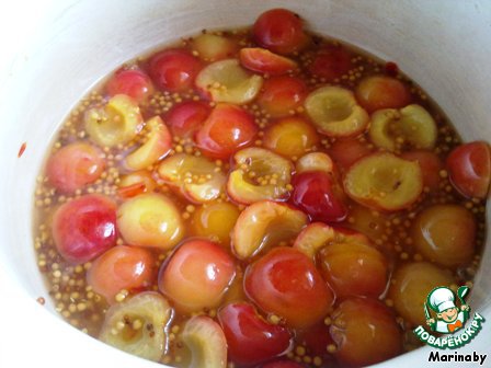 Когда сахар растворится и черешня станет мягкой, добавляем горчицу, соль, перец, соус чили.