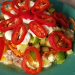Легкий, быстрый слоеный салат. Нашла рецепт в инете, не помню где. На мой вкус, в нем лишняя картошка, но домашним он нравится и в таком виде. Фото не очень удачно - слоев не видно.
