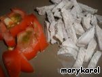 Говядину отвариваем в подсоленной воде; мясо и томаты режем брусочками