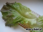 Салат латук режем полосками чуть больше ширины баклажанных пластинок