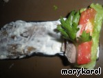 Начинаем собирать рулетики: баклажан мажем майонезом, на край кладем салат, кусочек мяса, томат и петрушку так, чтобы все ингредиенты выходили за край