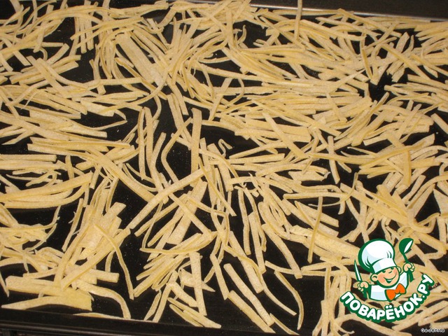 Порезать соломкой как можно тоньше (вкуснее будет потом). Подготовленную лапшу подсушить на воздухе, а лучше оставить на ночь, ничем не накрывая.