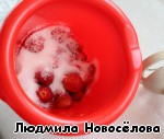 • Чистенькую и аппетитную ягоду поместим в чашу для взбивания, добавим сахар, немножко воды и поработаем блендером.