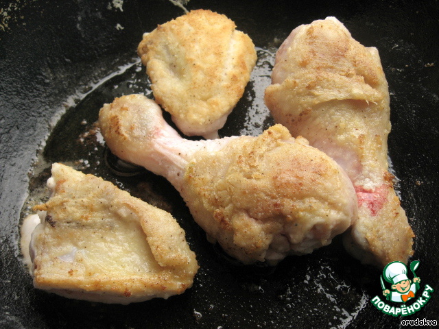 Выкладываем на сковороду, в которой жарилась наша курочка, и обжариваем до корочки. При необходимости нужно добавить ещё немного масла. Обжарили – выкладываем на тарелку.