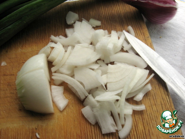А лук сюда не зелёный, а простой репчатый нужен был. А вот зелень в конце добавляется.
