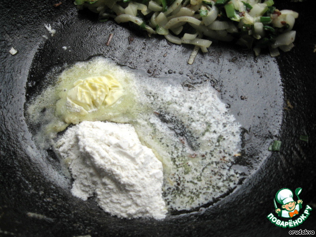Выложить лук или сдвинуть его в сторону. На свободном конце сковороды растопить небольшой кусочек сливочного масла и обжарить в нем 1-1,5 ст. л. муки. Я беру муку из оставшейся от панировки курицы.