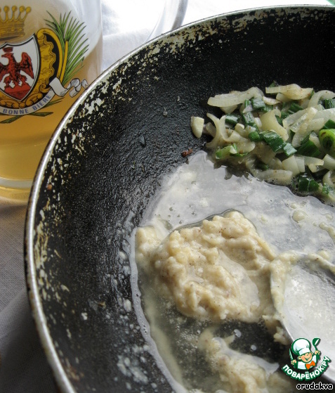 Лук нарезать четверть кольцами и обжарить всё на той же сковороде, всё так же - до корочки. В конце жарки добавить зеленый лук.