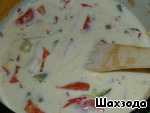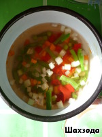Овощи (горошек, морковь, перец, фасоль, кабачок) посолить по вкусу, сварить и сцедить жидкость, в которой они варились.