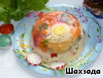 Заливаем в миску сначала желатин разведенный с овощным отваром (даем ему немного застыть), затем смешанный с овощами и майонезом. Отправляем в холодильник до полного застывания.