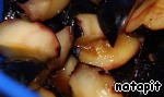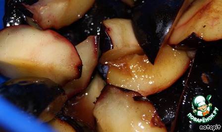 Сливы почистить и нарезать на четвертушки, залить вином, засыпать сахар (35 г), корицу и мускат, поставить в холодильник.