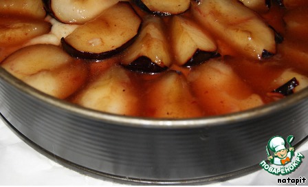 Вылить жидкость, стёкшую со слив, на тесто и поставить пирог в духовку, выпекать 40-45 мин. Ориентируйтесь на вашу духовку. -