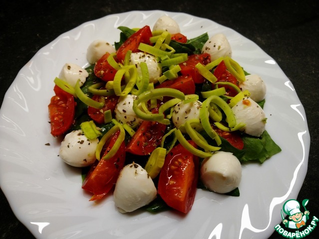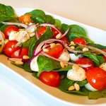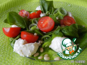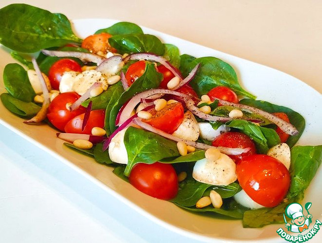 Выкладываем на тарелку шпинат, черри и мини-моцареллу, оставшийся лук. Посыпаем салат кедровыми орешками и поливаем заправкой.