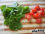 Шпинат очищаем и промываем, обсушиваем. Если листики большие, разрезаем. Помидорки разрезаем на половинки.