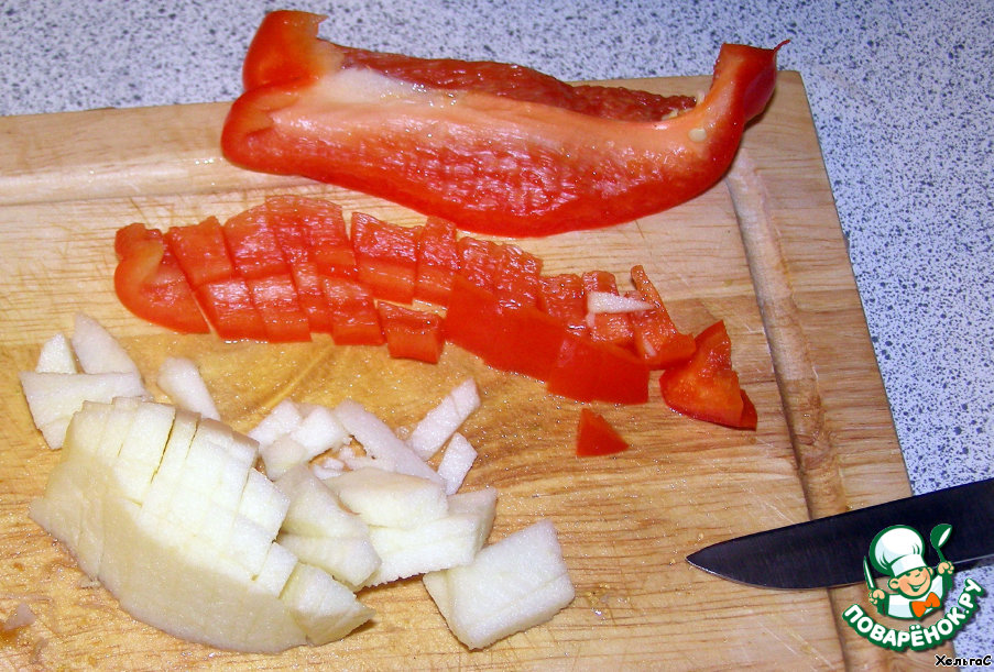 И кусочки индейки, и солёный огурчик нарежем мелко