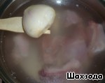 Мясо нарезать на небольшие кусочки, добавить целую головку луковицы, через 30 мин. лук удалить.