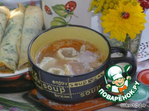Нарезанные блинчики положить в каждую тарелку с супом.