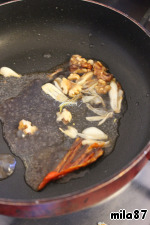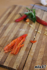 Теперь я взяла другую сковороду. Перец чили, чеснок и арахис слегка обжариваем минуты 3 в небольшом количестве масла. Извлекаем перец и чеснок, выкладываем обжаренное мясо.