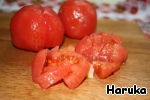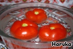 Тем временем помидоры залить кипятком на две минуты, затем вынуть из воды и очистить с них шкурочку.
