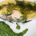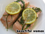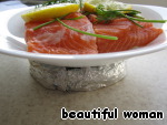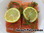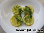 Сверху на них помещаем куски сёмги, снова прикрыв верх рыбы лимоном и укропом.